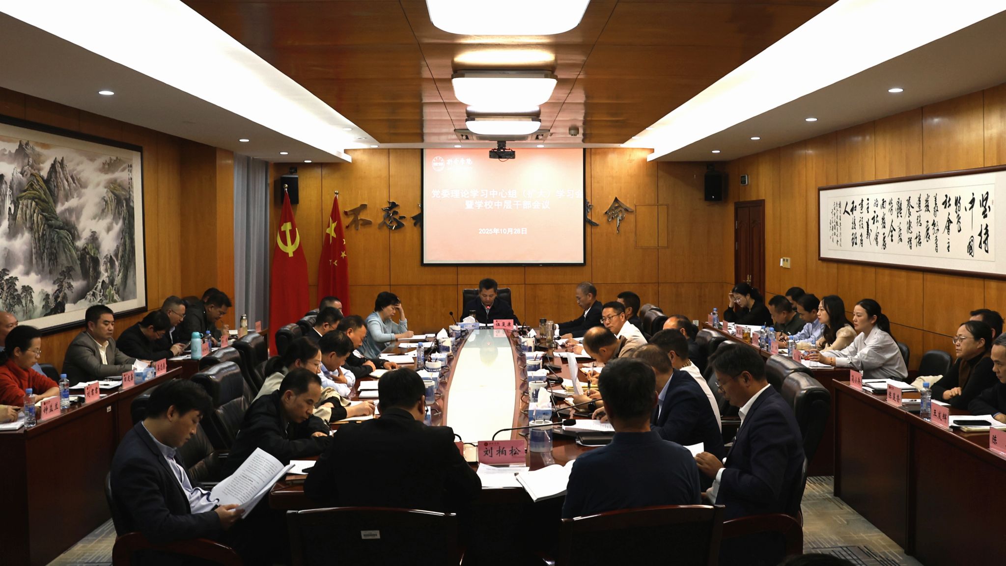 10月28日,校党委书记伍复康主持召开党委理论学习中心组(扩大)学习会暨学校中层干部会议,传达学习党的二十届四中全会精神,围绕《习近平谈治国理政》第五卷开展学习研讨。校党政班子成员、副厅级干部、全体中层正职参加学习。
