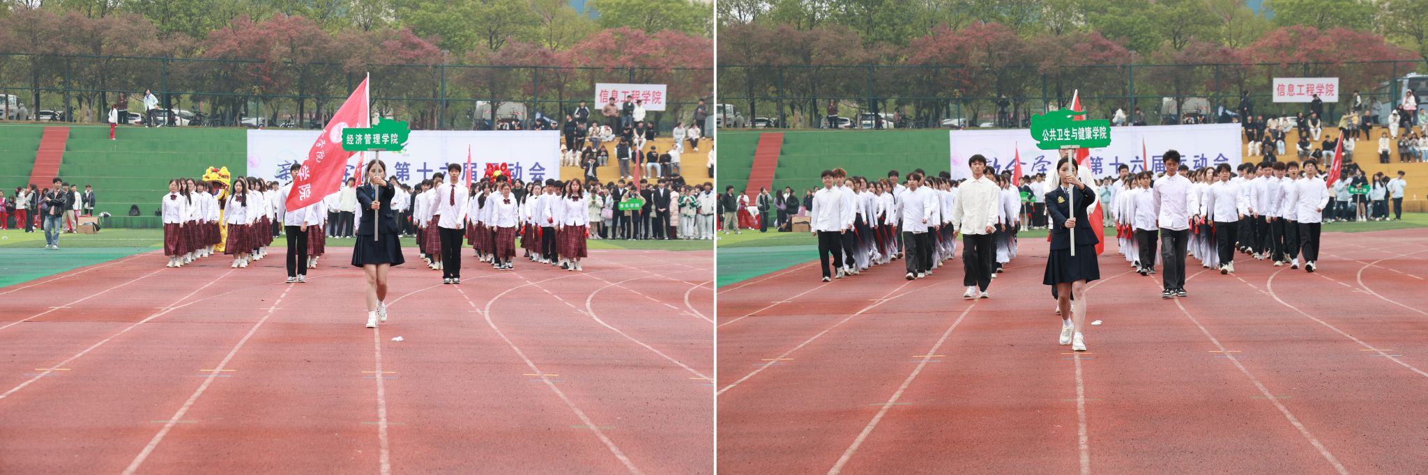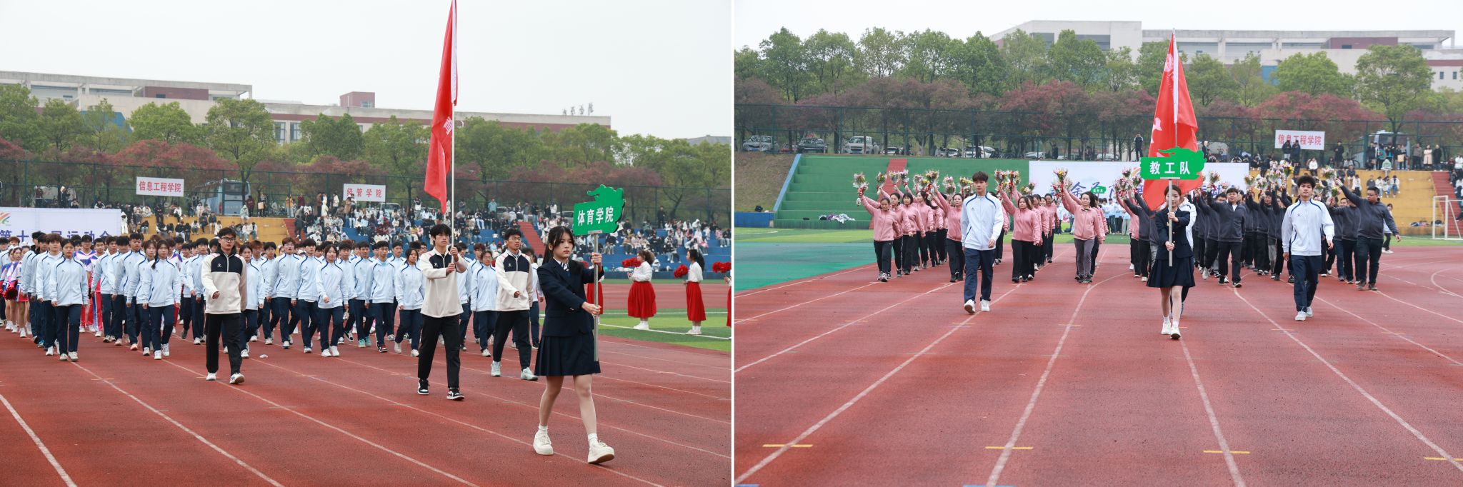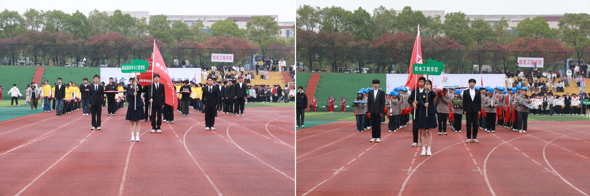 开幕式上,伴随着热情洋溢的运动会进行曲,各方阵队依次入场。国旗护卫队昂首挺胸,迈着坚定的步伐,护卫着鲜艳的五星红旗。各二级学院方阵身着特色服饰,迈着整齐的步伐,喊着响亮的口号入场,他们结合各自专业元素,融入优美动人的舞蹈、青春洋溢的健美操、现代与传统交织碰撞的情景展示、独具传统意蕴的舞狮表演,独特的创意、抖擞的精神,充分展现了我校学子昂扬向上、追求卓越的精神风貌。教工队和裁判方阵紧随其后,他们手持花束,和着轻快的舞步,脸上洋溢着活力与微笑,成为开幕式现场一抹温馨的亮色。新院师生的这份精气神,既是对学校四十年发展过往成就的致敬,更是对未来征程的坚定承诺。