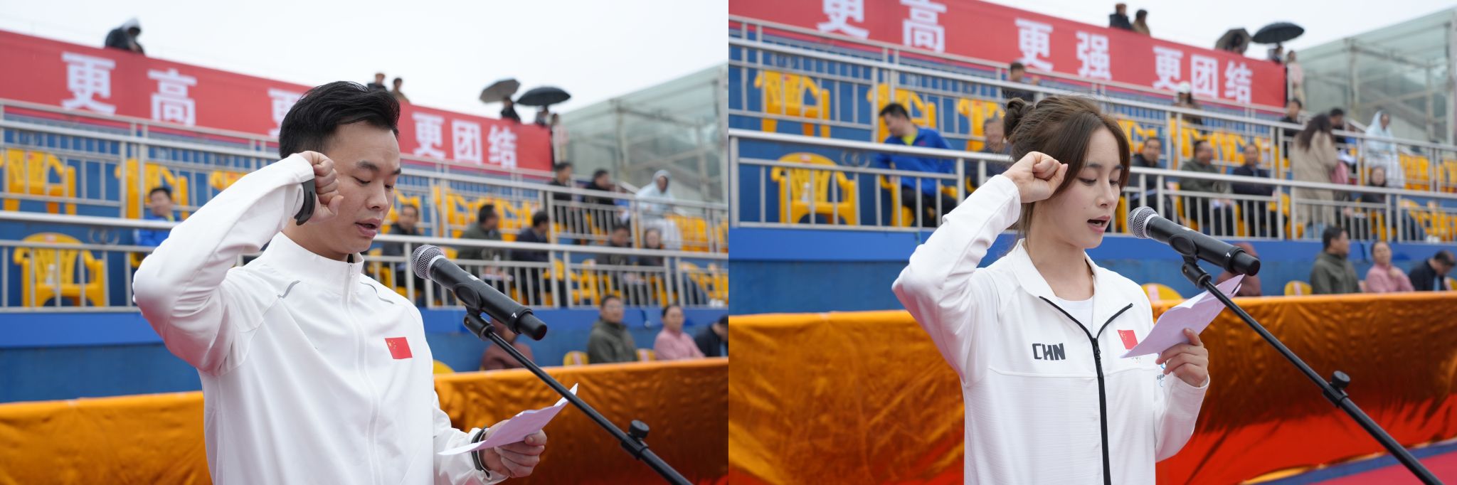 体育学院教师高云飞,体育学院2023级体育教育2班彭雅新分别作为裁判员代表和运动员代表宣誓。