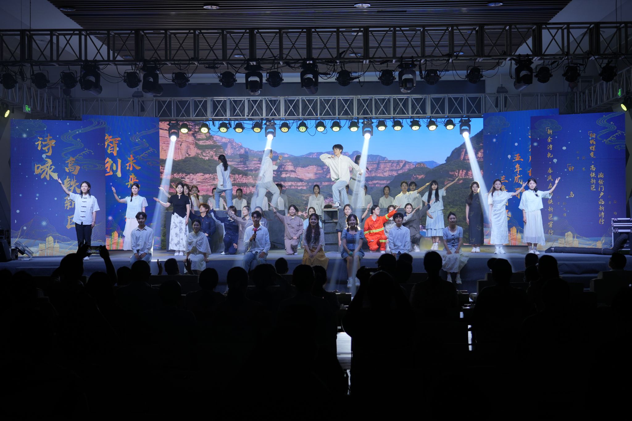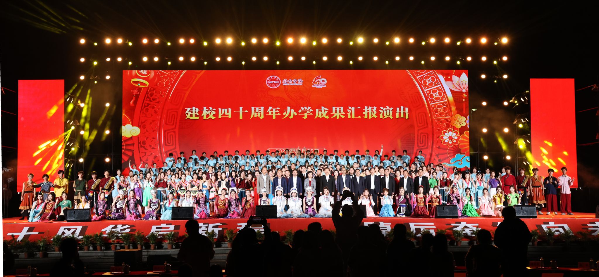办学成果汇报演出点亮校庆的高光时刻。10月25日晚,“四十风华启新程 踔厉奋发向未来”办学成果汇报演出在梦想广场隆重举行,五千余名师生校友现场观看,近万人线上同步参与。演出以“缘起—启航—绽放—奋进”为叙事主线,串联学校四十年发展历程。诗朗诵《这四十年》生动回溯从“半楼星火”到“万人学府”的办学历程;舞蹈《石榴花开》展现民族团结进步教育成果;情景剧《青春在这里闪光》深情讲述“全国脱贫攻坚先进个人”樊贞子的感人事迹,展现新院青年的责任担当。整场演出既是对学校40年奋斗历程的凝练总结,更是对开创未来的集体宣誓。