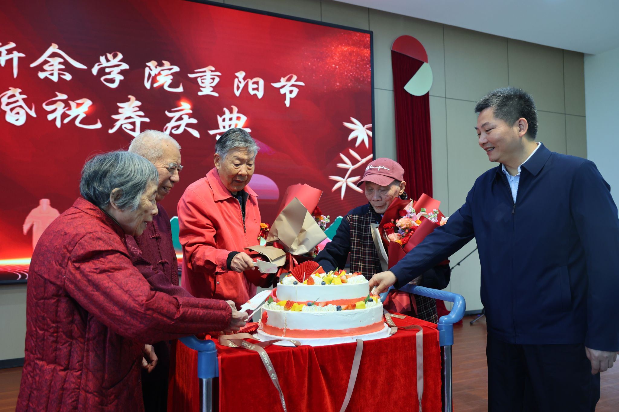2025年重阳节,学校为退休老教师们举办金婚祝寿庆典,温暖在校园里久久回荡。“结婚五十年了,没想到学校会为我们办这么隆重的庆典,收到这么多祝福,心里真是暖烘烘的。”李老师夫妇手牵着手,笑容里满是幸福。年届九旬的退休教师王老师也格外激动:“我今年九十岁了,学校还特意为我祝寿,太感动了。”