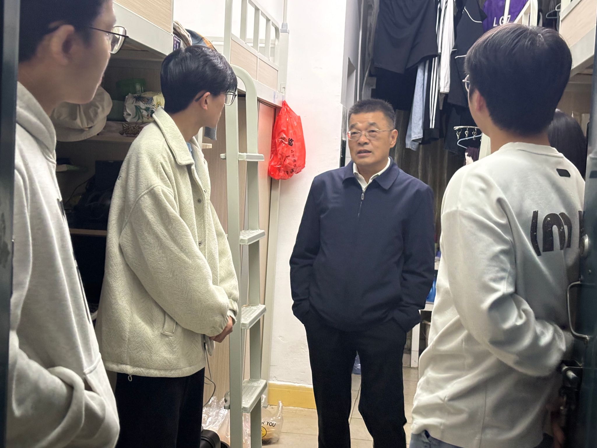 在学生宿舍,刘志勇与同学们亲切畅谈,他详细询问了同学们在医院的课程学习进度、临床见习体会以及日常生活起居等各方面情况,认真聆听了同学们在适应新环境、理论学习与实践结合过程中遇到的困难与收获。交流过程中,同学们踊跃发言,分享了在医院一线学习的所见所闻、所思所感,对医院提供的实践平台和带教老师的悉心指导表示感谢。
