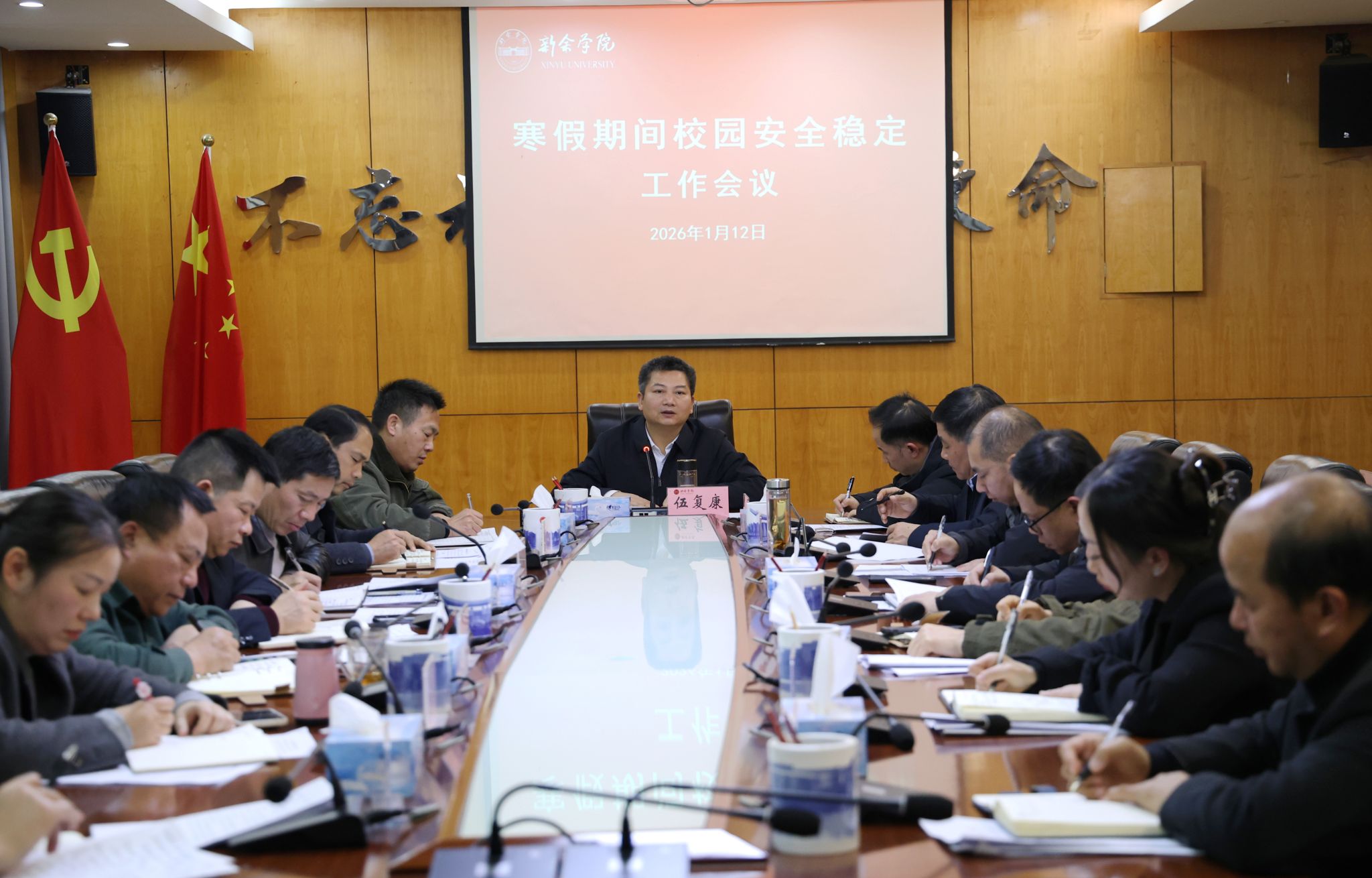 1月12日下午,我校在行政楼二楼会议室召开寒假期间校园安全稳定工作会议,深入研判假期安全形势,全面部署寒假期间校园安全稳定各项工作。校党委书记伍复康出席会议并讲话,校党委委员、副校长周小云主持会议,校党委委员、宣传部部长钟钺作专项工作部署。各相关职能部门主要负责同志、各二级学院党委负责同志参加会议。