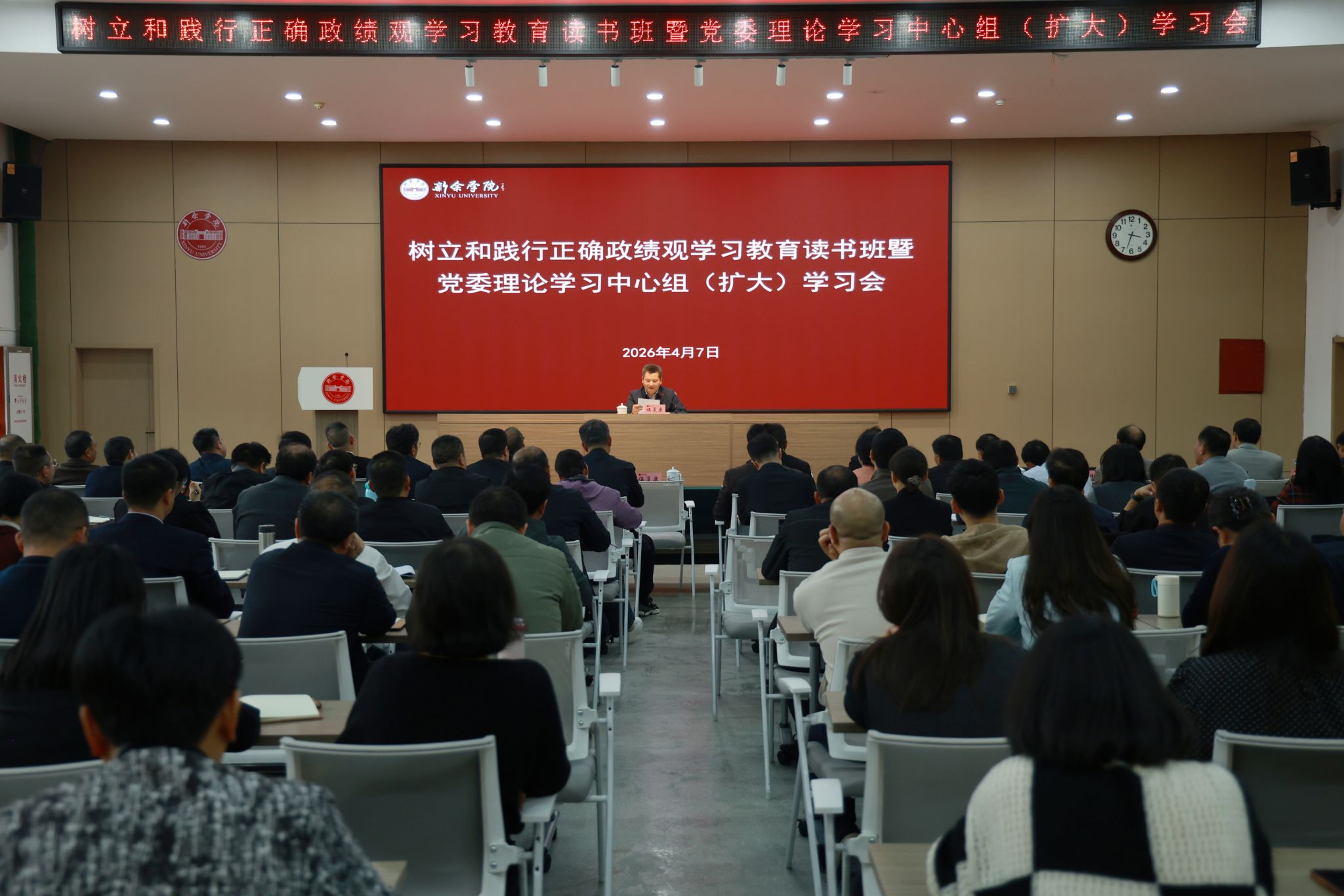 4月7日,学校在思源厅举办树立和践行正确政绩观学习教育读书班暨党委理论学习中心组(扩大)学习会。校党委书记伍复康主持开班式并作专题辅导,校党政班子成员、副厅级干部、全校中层正副职参加学习。