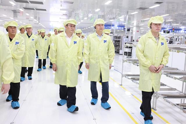 在佛吉亚歌乐电子有限公司车间内,十余台AGV智能物流机器人正在工厂车间内穿梭,一块大型显示屏正实时展示着工厂碳足迹。考察团一行近距离体验工业4.0智能生产线给企业生产、物流配送、智能仓储带来的生产变革,亲身感受企业着力打造世界一流绿色工厂,在科技创新方面带来的变化。