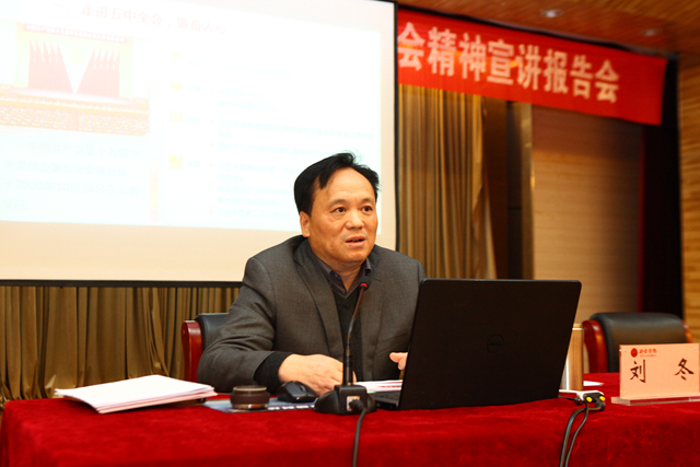 11月24日下午,校党委书记刘冬在图书馆学术讲堂以“擘画蓝图、砥砺奋进——学习党的十九届五中全会精神”为题,向我校各级团的骨干、政治辅导员、校级大骨班全体学员、大学生理论宣讲团成员、学生党员、团支书代表等250余人宣讲党的十九届五中全会精神。