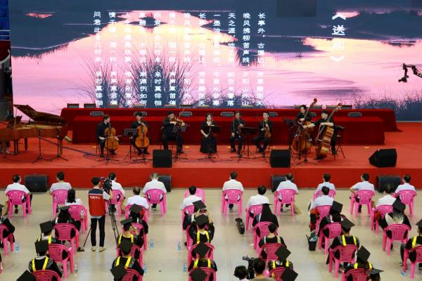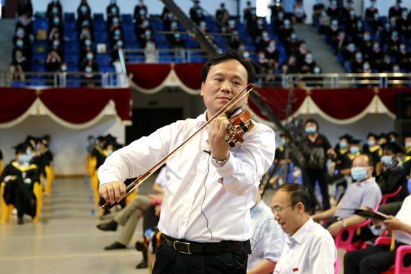 新余学院爱乐乐团为欢送2020届毕业同学,倾情奉献了一场小型音乐会,《送别》、《步步高》、《同一首歌》、《奉献》等乐曲,让同学们在用音乐演绎的光阴故事里,静静回忆这段最美的时光。最后,党委书记刘冬用小提琴领奏,学校领导、老师们登台齐唱《友谊地久天长》,表达着对同学们依恋不舍之情,为即将分别的毕业生送上最真挚的祝福。在学校老师们的歌声和泪光中,同学们一步一回头缓缓离开毕业典礼现场,流下激动的泪水。充满仪式感的典礼让同学们的脸上洋溢着幸福与感动。