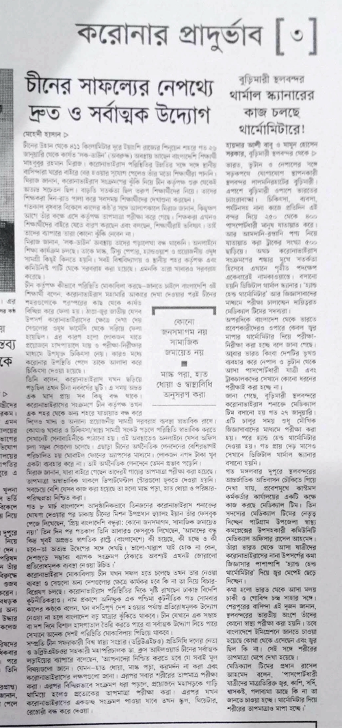 其中《孟加拉国应该如何学习中国抗击新冠肺炎》于3月12日被孟加拉当地最著名的报纸Kaler Kontho刊登。文章介绍了新余市委、市政府对于留学生防控工作的重视以及新余学院在疫情防控期间如何细致关心、资助帮扶和如何管控留学生所做的工作,同时,文章介绍了世界卫生组织WHO对中国的抗疫举措和成效的肯定,包括居家隔离、关闭公共场所、基层排查、免费收治确诊病例,同时保证基本生活物资供应及物价稳定等。在面对孟加拉国日益严峻的疫情形势下,文章呼吁孟加拉国人民要学习中国的成功经验,抗击病毒。