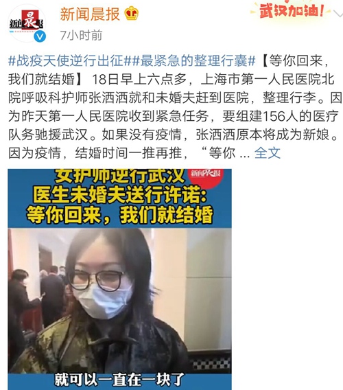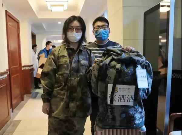 理着理着,张洒洒就激动地流泪了。谁能想到,如果没有疫情,张洒洒原本将成为新娘。因为疫情,结婚时间一推再推,今天她没有穿上婚纱,却穿上了医院统一配备的迷彩服逆行武汉。“等你回来,我们就结婚。”一旁的未婚夫也是医生,今天也会赶到发热门诊和疫情奋战。作为同行,他特别理解和支持张洒洒的援鄂之行。昨天第一时间知晓未婚妻即将出发时,未婚夫就想带张洒洒买钻戒一同带去武汉,留下回来的念想。张洒洒拒绝了,她决定回来买,“武汉回来后的第一件事就是去买钻戒去结婚。” ………