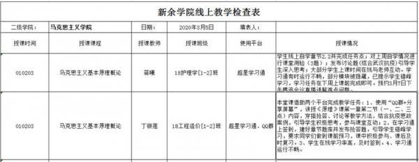 为规范网络教学秩序,提升网络教学质量,马克思主义学院在教务处、教学质量评估与督导中心支持下,严格在线教学管理,充分发挥教学督导的作用,制定在线教学督导检查方案,对每日所有思政课程教学做到检查全覆盖、无遗漏,并实行“日报制度”,教研室主任每天认真检查填写线上教学检查表,并及时反馈问题,提出针对性建议。