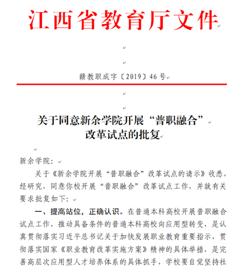 批复指出,在普通本科高校开展普职融合试点工作,推动具备条件的普通本科高校向应用型转变,是认真贯彻落实习近平总书记关于加快发展职业教育重要批示,贯彻落实国家《职业教育改革实施方案》精神的具体举措,是完善高层次应用型人才培养体系的具体抓手。新余学院要自觉坚持社会主义办学方向,深入贯彻落实党中央、国务院关于职业教育改革发展的部署,从完善江西特色职业教育体系的角度,正确认识开展“普职融合”改革试点的重要意义和重要使命,进一步提升学校的办学水平和服务能力。
