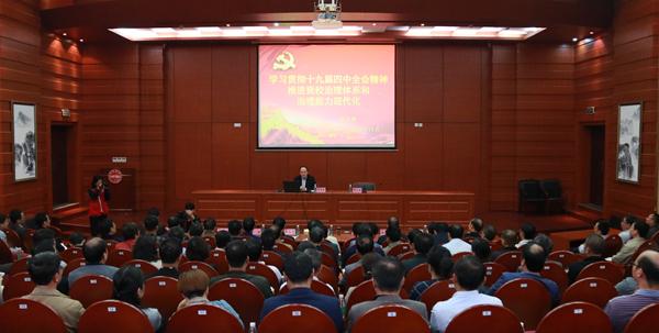 报告会上,徐忠麟从十九届四中全会召开的时代背景和重要意义、十九届四中全会的主要精神、对我校治理体系现代化的思考、 对我校治理能力现代化的建议等四个方面进行了系统宣讲和阐释。他强调,党的十九届四中全会是我们党站在“两个一百年”奋斗目标历史交汇点上召开的一次十分重要的会议,是在新中国成立70周年之际、我国处于中华民族伟大复兴关键时期召开的一次具有开创性、里程碑意义的会议。就如何推进我校治理能力现代化,他认为,一要熟悉以大学章程为核心的系统的管理制度体系;二要树立法律意识,形成法治思维和法治方式;三要依法依规决策、执行、处理争议和接受监督。