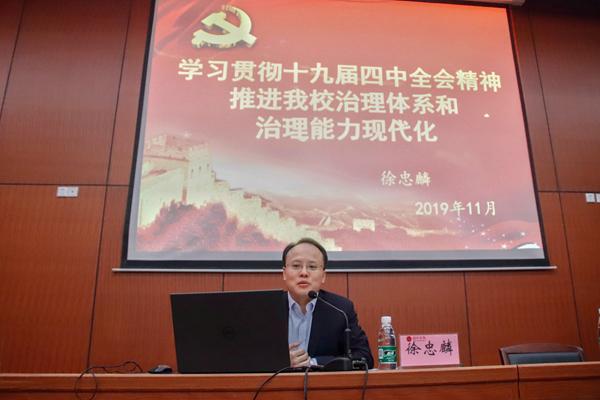 为深入学习贯彻党的十九届四中全会精神,11月12日下午,校党委委员、副校长徐忠麟作了题为“学习贯彻十九届四中全会精神推进我校治理体系和治理能力现代化”的宣讲报告。校党委书记刘冬、校长张玉清及党政班子成员刘晓燕、胡涌、陈裕先、李敏、龚丽春、郭瑞新、姚伟出席报告会。党委委员、宣传部部长周文生主持报告会。学校副处级以上领导干部参加报告会。