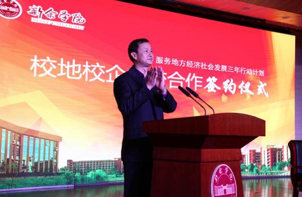 刘冬在致辞中代表校党委、行政及全校师生向前来参加签约仪式的各位领导和同志们表示热烈的欢迎和衷心的感谢。他表示,学校按照对接地方优势产业,服务新余发展大局的指导思想,以培养“品德素养好、应用能力强、就业有实力、发展有后劲”的高素质应用型人才为主要目标,不断优化课程结构和人才培养模式,强化全员、全过程、全方位育人理念,教育教学质量稳步提高。近年来,学校积极推进转型发展,走出了一条产学研合作的发展道路。他强调,学校将以此次签约为新的起点,进一步加强与兄弟院校、各市县区、企业的合作交流,不断拓宽办学渠道,提升办学质量和水平,为学校更好地服务钢铁、新能源、光电信息、装备制造、机械机电、生物医药等重点产业打下坚实基础。希望学校有关教学单位和部门主动加强与兄弟院校、各市县区、企业的对接工作,积极寻找合作的切入点,开展互动交流,多开展技术攻关合作,使合作不断常态化,真正实现双赢的良好局面。