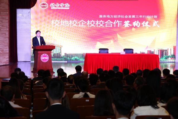 根据中央主题教育办“五个围绕”“三个新突破”的要求,为积极有效推动“服务地方经济社会发展三年行动计划”,全力促进新宜吉跨行政区转型合作试验区建设,全面扩大对外合作交流,深化“产教融合、校地合作、协同创新、协同育人”理念,不断提升学校服务地方经济社会发展能力和水平,11月15日,我校举行校地校企校校合作签约仪式。省政协副主席、九三学社江西省委主委李华栋,省政协常委、副秘书长、九三学社江西省委专职副主委肖礼庆,市人大常委会副主任刘超杰,副市长肖铁军,市政协副主席孔祥筛,华东交通大学党委书记万明、副校长张坚,我校党委书记刘冬,校长张玉清、副校长李敏,新宜吉六县跨行政区转型合作试验区所辖县区、对口支援定南县领导,企业及有关部门领导和嘉宾出席签约仪式。学校各部门、各二级学院负责人,师生代表共计400余人参加仪式。仪式由副校长胡涌主持。