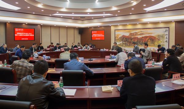11月21日下午,校党委理论学习中心组在图书馆天工论坛举行党的十九届四中全会精神学习研讨会。校党委书记刘冬主持会议并讲话,省委第四巡回指导小组成员刘晨出席指导,校党政班子成员刘晓燕、胡涌、李敏、龚丽春、郭瑞新、姚伟、周文生出席会议。各二级学院、各部门主要负责人参加会议。
