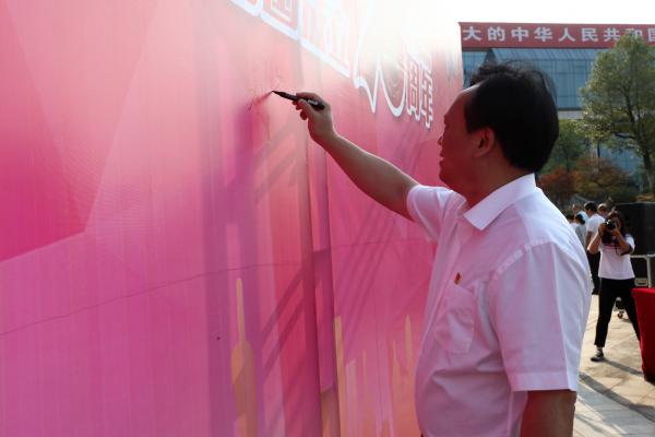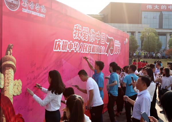 为庆祝中华人民共和国成立70周年,深入推进“不忘初心、牢记使命”主题教育,10月1日上午,新余学院万余名师生隆重聚会,举行庆祝新中国成立七十周年升国旗暨“我爱你,中国”签名仪式。万余名师生在梦想广场发出时代最强音——“我爱你,中国”。校党政班子成员刘冬、张玉清、胡涌、陈裕先、李敏、龚丽春、郭瑞新、姚伟、周文生、曾浩武,各二级学院、各部门负责人及全体师生共同参加仪式,党委副书记刘晓燕主持仪式。