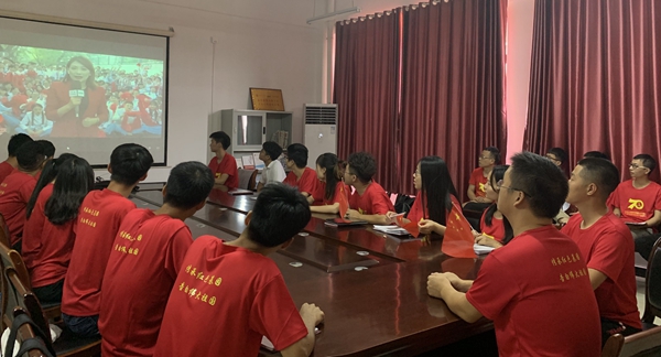 10月1日上午,庆祝中华人民共和国成立70周年大会在北京天安门广场隆重举行。中共中央总书记、国家主席、中央军委主席习近平出席大会并发表重要讲话。上午10时,校党政班子成员刘冬、张玉清、刘晓燕、胡涌、陈裕先、李敏、龚丽春、郭瑞新、姚伟、周文生、曾浩武在行政楼党委会议室集中收看了庆祝中华人民共和国成立70周年大会、阅兵式和群众游行直播盛况。全校54个党支部,近800名党员及全体师生分别在会议室、学生活动中心、教室、宿舍、食堂等多种场所,通过网络直播、有线电视、广播、手机等多种方式收听收看,实现全校师生学习观看全覆盖。现场气氛热烈,师生们为伟大祖国取得的辉煌成就喝彩鼓掌。共同感受祖国强劲的脉搏,共同畅想祖国更加美好的明天。