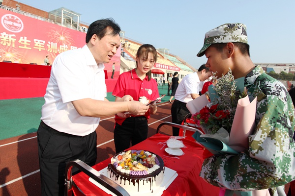 会上,与会领导为受表彰的优秀教官和优秀学员颁奖;军训学生代表作了发言。“祝你生日快乐,祝你生日快乐……”一曲《生日快乐歌》在田径运动场上空回荡,学校领导及参加2019级学生军训成果检阅仪式的全体师生为当天过生日的24名参训新生共同唱响一首生日歌,并送上了鲜花和生日蛋糕,为他们过了一个难以忘怀的生日。