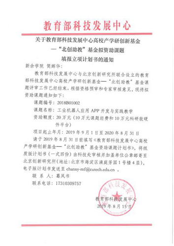 根据《教育部科技发展中心高校产学研创新基金——“北创助教”基金拟资助课题填报立项计划书的通知》,我校机电工程学院简辉华老师主持的《工业机器人应用APP开发与实践教学》项目被列入资助计划予以立项,资助经费20万元。