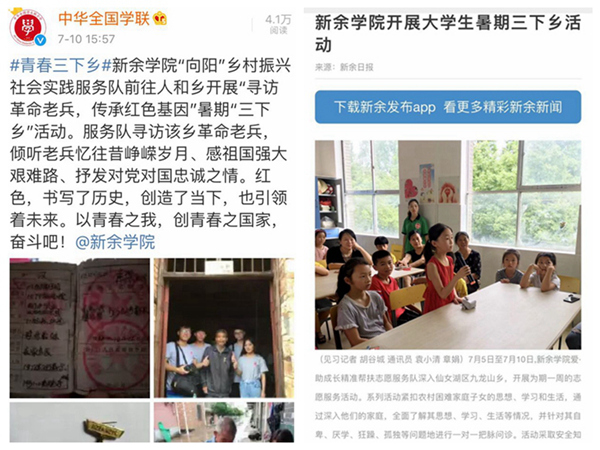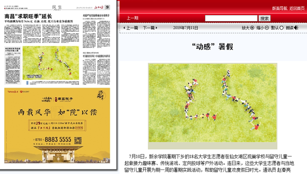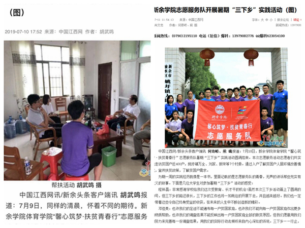 自7月4日学校大学生暑期“三下乡”社会实践活动启动以来, 18支志愿服务团队,300余名志愿者们深入学习贯彻习近平新时代中国特色社会主义思想和党的十九大精神,深入贯彻落实习近平总书记考察江西重要讲话精神,积极投身于文明城市创建,配合乡村振兴战略实施,进行为期一周的以青年马克思主义培养、政策宣讲、教育关爱、文化宣传、送医下乡和家电维修、扶贫等为主要内容的暑期社会实践活动。志愿者们在社会实践中接受教育、汲取智慧、施展才华、增长才干、做出贡献,展现最富活力的青年风貌,取得了可喜的成绩。同时,引起了各级媒体的广泛关注。中国新闻社、江西日报、中国江西网、江西青年网、江西新闻等媒体进行了深入广泛的报道。