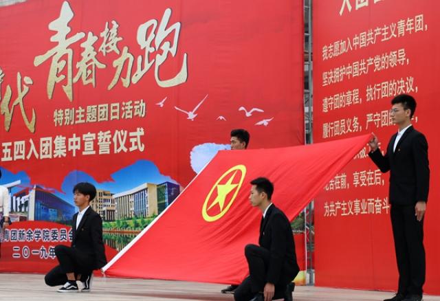 活动在嘹亮的国歌声中拉开序幕。刘冬等校领导为荣获2018年度“五四红旗团委”、 “五四红旗团支部”、“优秀共青团员”、“优秀共青团干”的先进单位和个人颁奖。在随后举行的“追梦新时代·青春接力跑”特别主题团日活动活动中,刘冬为接力跑学生代表授旗。在大家的注视下,一群朝气蓬勃的新余学院学子,身穿统一服装,挥舞着双手,昂首挺胸地奔向终点,带领大家共同重温百年奋斗历史,重走峥嵘革命历程,充分展现了新余学院学子传承五四精神, 放飞青春梦想,不忘历史、砥砺奋进的精神面貌,现场气氛十分活跃。作为当代青年,要牢记五四历史,传承五四精神,铭记百年前五四运动浓浓的家国情怀与厚重的爱国底色。在五四入团集中宣誓仪式上,校领导们为新团员代表颁发团员证,佩戴团徽。1000余名新、老团员面向团旗庄严宣誓。