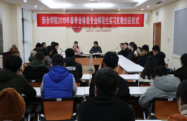 为进一步狠抓本科教育,落实立德树人根本任务,根据《江西省高校音体美专业师范生实习支教工作实施方案》和《关于切实做好2019年春季学期高校音体美专业实习支教工作的通知》文件精神,2月23日,我校在行政楼一楼会议室举行新余学院2019年春季音体美专业师范生实习支教出征仪式,校党委委员、副校长龚丽春出席并为实习生授旗,学校教务处负责人主持仪式,艺术学院、体育学院负责人以及实习生代表分别做了表态发言。来自艺术学院、体育学院的4名指导老师、音乐学专业30人、体育教育专业10人参加了出征仪式。