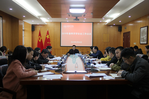 为确保春季开学工作安全有序进行,2月26日上午,我校在行政楼二楼会议室召开2019年春季开学安全工作会议,校党委委员、副校长胡涌同志主持会议,各有关部门、二级学院分管安全工作领导参加了会议。会上传达了教育部、省教育厅有关校园安全稳定工作文件的精神,并就我校安全稳定工作和校园及周边安全隐患排查工作进行了布署及责任分工。