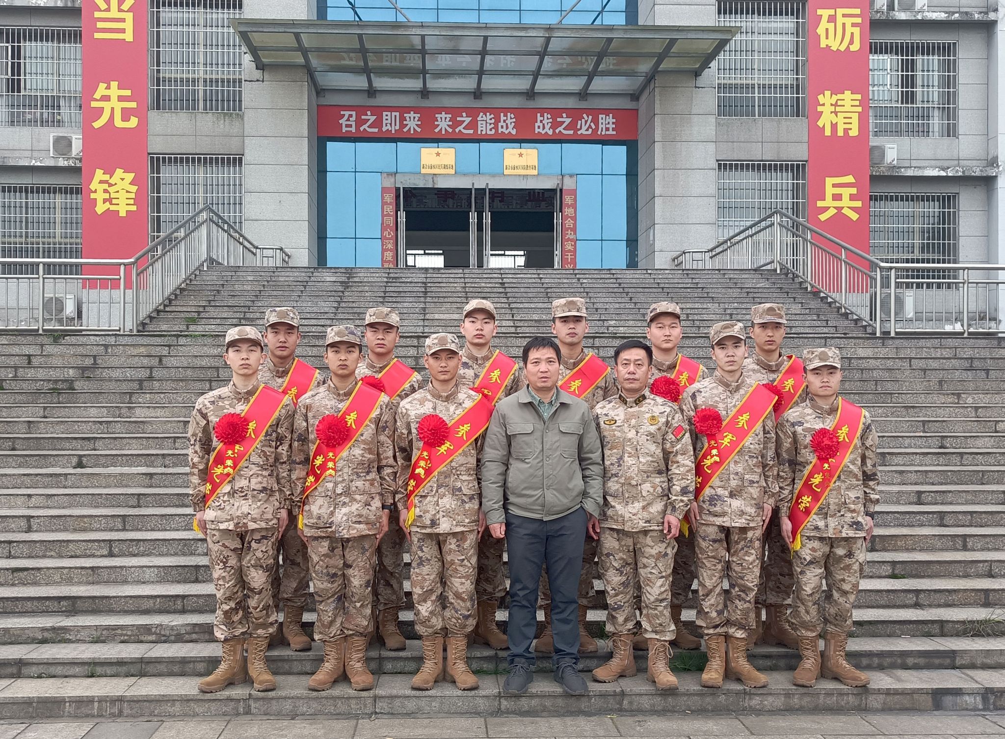 携笔从戎赴军营,青春报国启新程。近日,我校武装部一行专程前往渝水区训练基地,为11名即将光荣入伍的春季新兵举行欢送仪式,传递母校关怀,寄予殷切期望,共同见证学子们投身国防、报效祖国的光荣时刻。