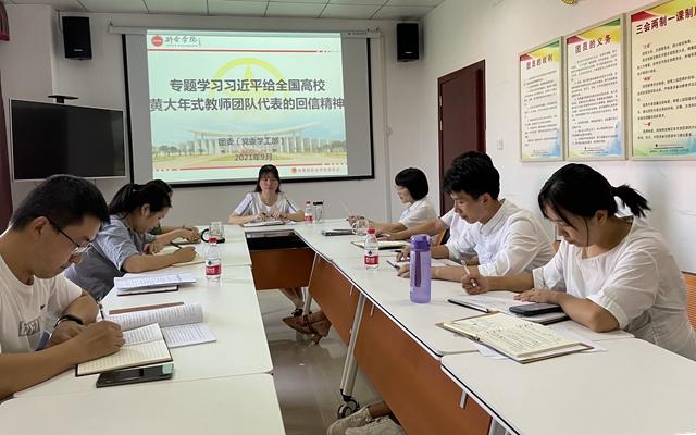 近日,团委(党委学生工作部)全体教师开展了“习近平总书记给全国高校黄大年式教师团队代表重要回信精神”专题学习会,会议学习了回信全文,要求全体教师要把贯彻落实总书记重要回信精神与党史学习教育结合起来,以黄大年同志为榜样,真正把为学、为事、为人统一起来,当好学生成长的引路人,为培养德智体美劳全面发展的社会主义建设者和接班人、全面建设社会主义现代化国家不断作出新贡献。