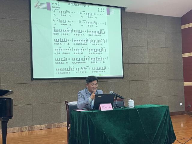 熊教授先播放了他创作的歌曲《红土地上红歌飞》,以提问的方式请同学们谈谈从歌曲中听到了哪些江西元素,并分别对这些富有江西特色的音乐素材进行分析,以此引出今天的主题:“江西红色音乐与我的创作实践”。熊教授对“红色音乐文化”的溯源以及文化内涵做出了自己的阐释:红色音乐作为一个特色文化符号,是中华优秀文化的杰出代表,是凝聚中华儿女的民族情感,构建国家认同的重要纽带。接下来熊教授还分享了他创作的二胡与民族管弦乐队作品《老表》,女声独唱《源头活水》等作品,对歌曲的艺术特色、创作构思进行解读,让同学们感受到江西红色音乐文化元素创新发展带来的艺术魅力。