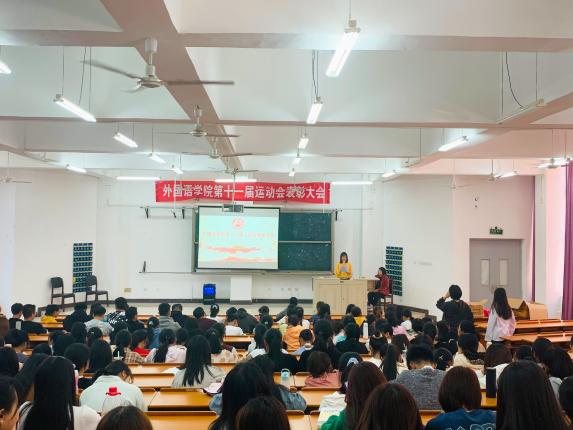 为表彰校运会外国语学院运动员所取得的优异成绩,2020年11月18日,外国语学院召开2020年第十一届运动会表彰大会,全体辅导员、运动员、鲜花队及方阵队及学生会相关工作人员出席,大会由外国语学院团委书记李胜男主持。