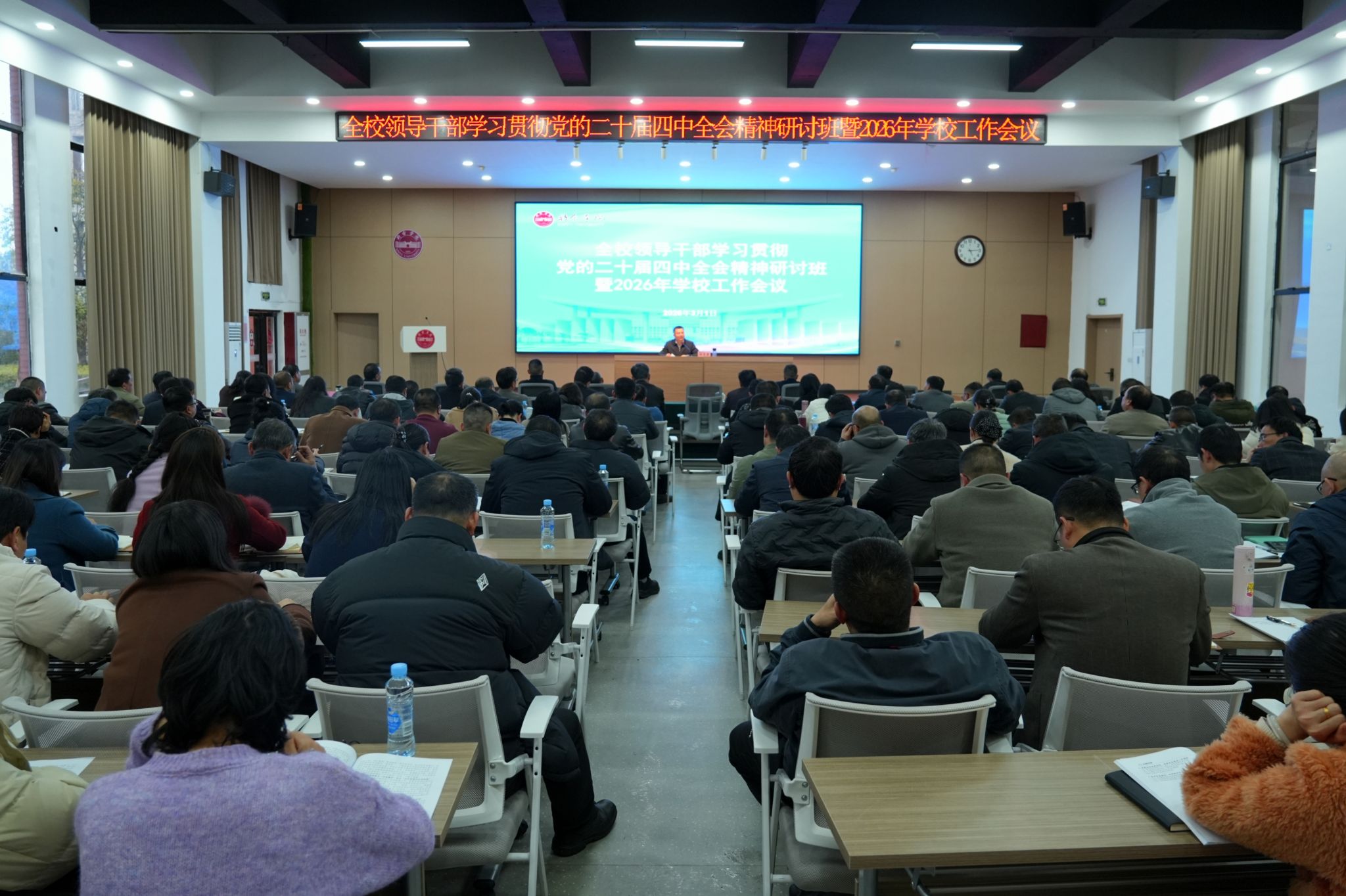 3月1日,学校在思源厅举办全校领导干部学习贯彻党的二十届四中全会精神研讨班暨2026年学校工作会议,深入学习贯彻党的二十届四中全会精神和习近平总书记在省部级主要领导干部专题研讨班上的重要讲话精神,传达学习全省市厅级主要领导干部专题研讨班精神、2026年全省教育工作会议精神,研究部署2026年全校重点工作。校党委书记伍复康主持会议并作总结讲话,校党委委员、副校长刘力恒传达相关会议精神。校党政班子成员,全体中层正副职,学校相关部门全体人员参加学习。