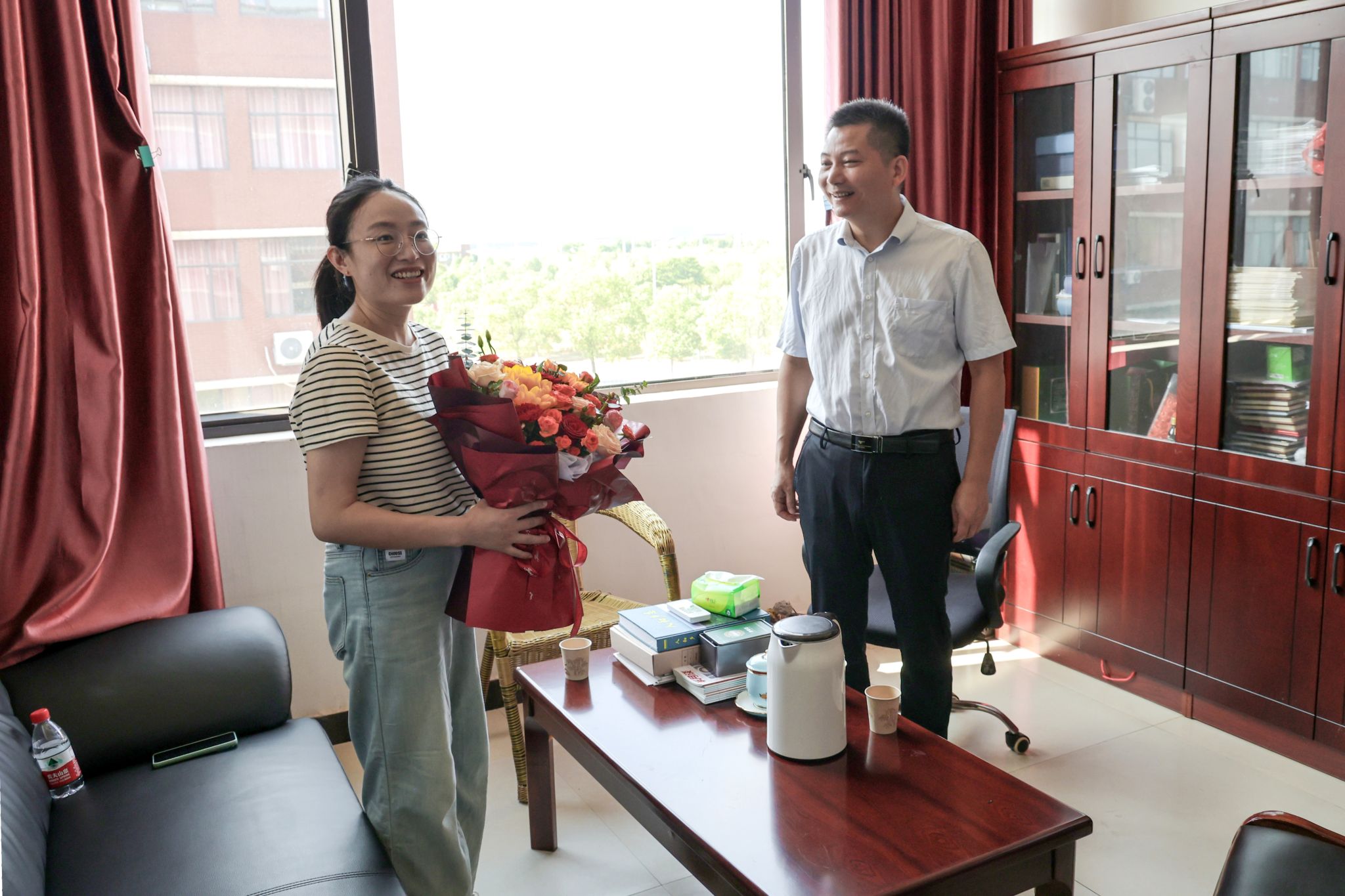 “学校的发展离不开每一位教师的默默奉献,你们辛苦了!”在新能源科学与工程学院,伍复康将花束送给了刚刚获批学校首个国家自然科学基金青年科学基金项目的付海燕博士,他对项目团队取得的成果给予充分肯定,对攻坚克难的精神表示赞赏,对他们为学校科研工作付出的辛勤劳动表示感谢,详细询问了团队工作、学习情况,认真听取了他们在科研工作中面临的困难和对学校科研工作的意见建议。