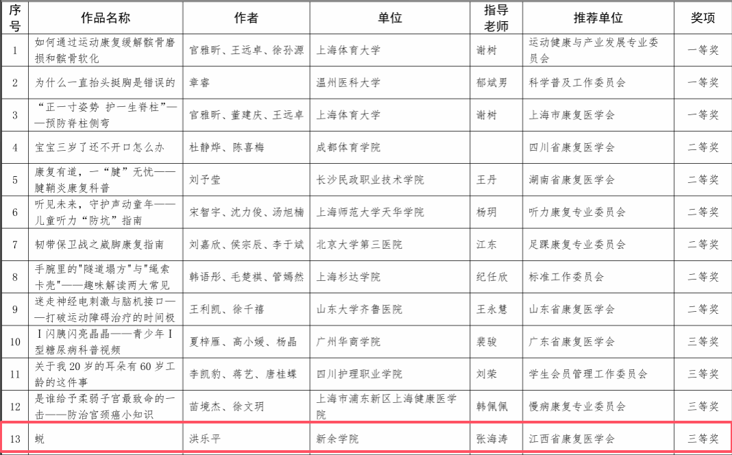 近日,首届中国康复医学会科普大赛获奖名单公布,我校公共卫生与健康学院2024级护理2班学生洪乐平参赛并获大赛三等奖。