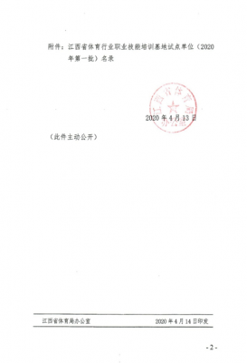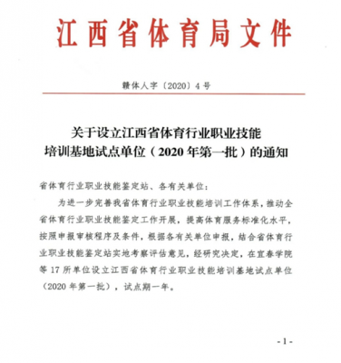 4月14日,江西省体育局赣体人字(2020)4号文件批复,新余学院获(2020年第一批)江西省体育行业职业技能培训基地试点单位。