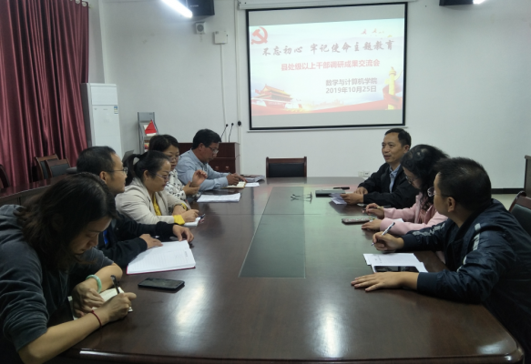 10月25日下午,数学与计算机学院在二楼会议室召开了“不忘初心、牢记使命”主题教育调研成果交流会,该院处级以上领导干部全面梳理里他们的前期调研成果,交流如何结合主题教育抓实数计学院各项工作。学校巡回指导二组到会指导。