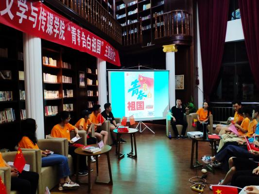 青春砥砺前行,深情告白祖国,在庆祝新中国成立70周年之际,文学与传媒学院“赣青扶贫筑梦乡村·致敬新中国成立70周年‘微光’志愿服务暑期实践团”的成员们在文E书香教室内齐聚一堂,用他们的方式深情告白祖国,分享参与暑期文明实践活动的点点滴滴。该院党委副书记周露和政治辅导员们与学生党员、入党积极分子代表、学生干部代表、新生代表们一起聆听分享,说感悟、谈体会。