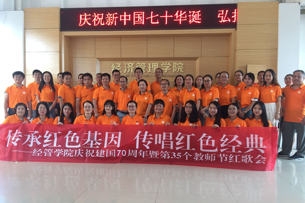 今年是新中国成立70周年。为传承红色基因,牢记初心使命 ,进一步加强经济管理学院师德师风建设,激励全体教职工热爱教育事业,开拓创新,积极工作,向新中国成立70周年献礼,9月10日,经济管理学院全体教职工开展了以“传承红色基因 唱响红色歌曲”为主题的庆祝活动。