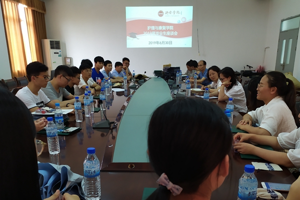6月30日,护理与康复学院在学院一楼会议室举行2019届毕业生座谈会。学院院长吴玉华、党委书记李晖和各科室负责人参加了本次座谈会,部分2019届毕业生参加了本次会议。