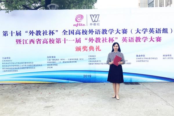 由江西省教育厅主办的第十一届“外教社杯”全国高校外语教学大赛江西省赛区决赛于5月31日至6月2日在南昌工程学院举行。本次大赛吸引了来自全省39所本科高校的众多英语教学骨干教师参与,经过两天的激烈角逐,我校外国语学院柳敏老师获本科综合组二等奖。