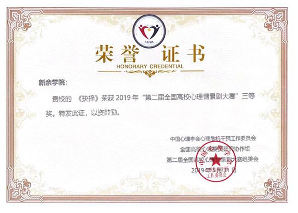 近日,第二届全国高校心理情景剧大赛在西安举办,经过激烈的角逐,我校心理情景剧《抉择》在此次大赛中荣获三等奖,林麟、朱阿敏、章娟荣获优秀指导老师奖。