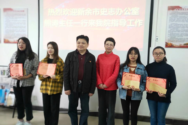 5月7日,新余市史志办主任熊涛一行四人来到文传学院,为参加《回望峥嵘读初心——发生在新余红土地上的经典革命故事》一书编撰工作的学生颁发证书,并与学院开展工作交流。