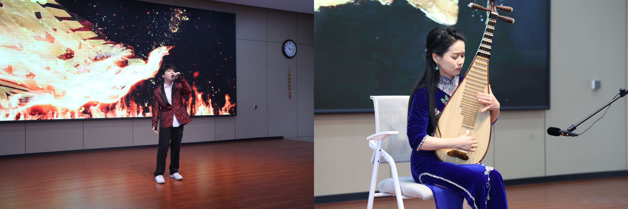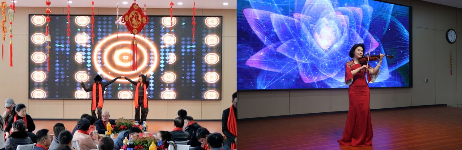 团拜会上,我校师生与合作单位、留学生代表联袂献上精彩的文艺演出。校企合作单位“艺舞舞蹈”以热情奔放的拉丁舞《来跳舞吧》开场,瞬间点燃全场气氛;2025校园十佳歌手曾志霖、余真清先后登场,分别演唱《晚风心里吹》与《黄种人》,温柔婉转、激昂豪迈的歌声,传递出对学校的深厚情感与奋进斗志;袁美清老师的琵琶独奏《十面埋伏》气势磅礴,奏响攻坚克难的奋进旋律;留学生带来充满活力的舞蹈《Loco Contigo》,展现了跨文化的青春风采;兰佳老师的小提琴曲《我们的爱》旋律悠扬,真挚表达对学校的深情;耿俊超老师演唱的《鸿雁》醇厚绵长,传递游子对母校的深深眷恋。最后,师生合唱《恭喜发财》,喜庆欢快的旋律中,大家举杯同庆,现场欢声笑语、祝福交融,共祝新院的明天更加辉煌!
