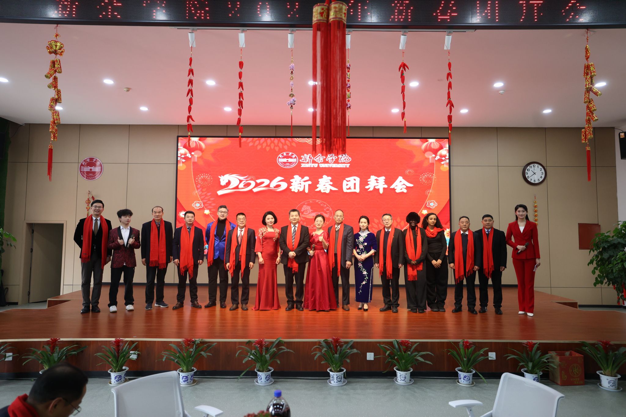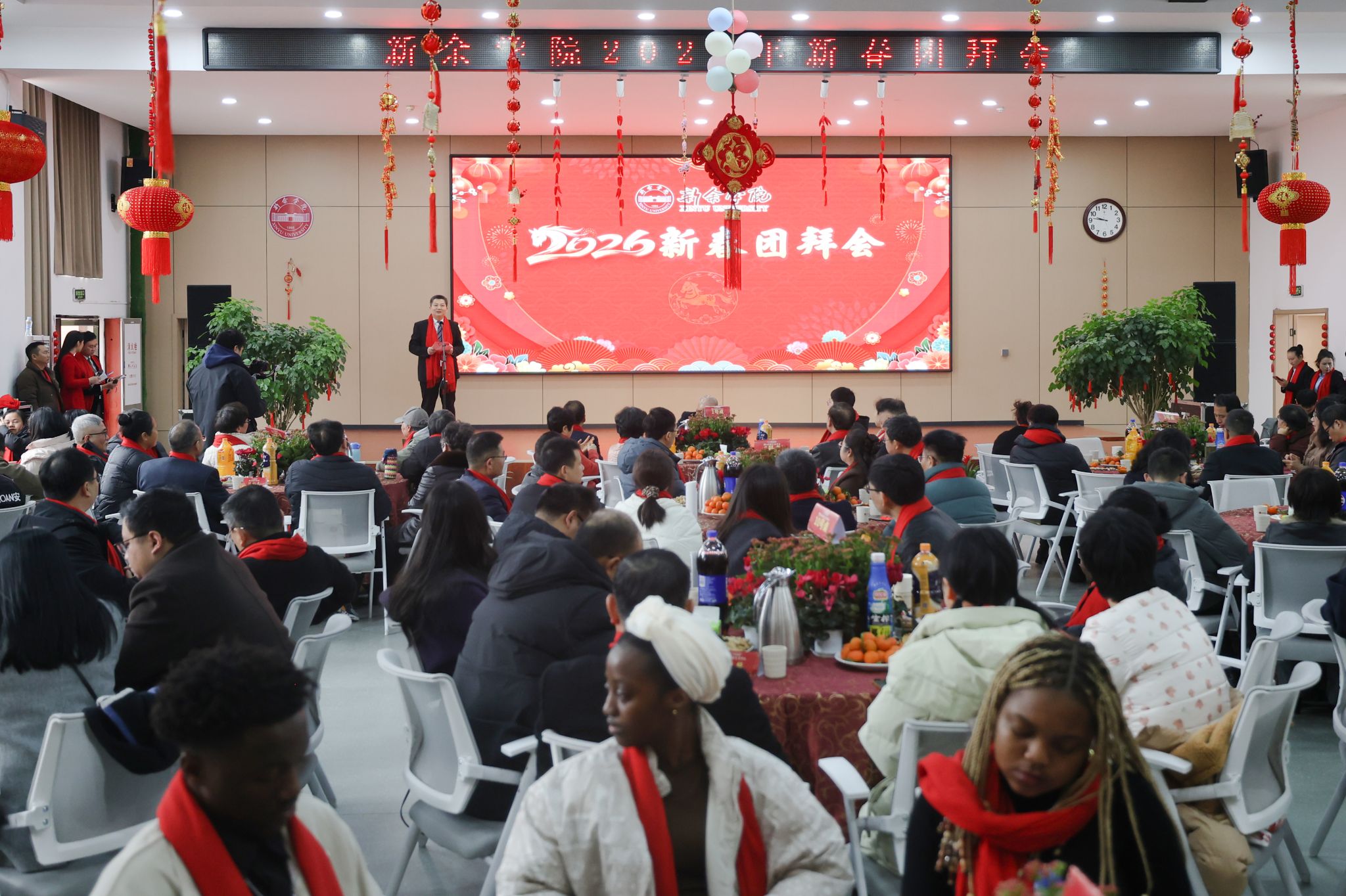 立春启序,万象更新。2月4日上午,新余学院2026年新春团拜会在思源厅举行。会场外,花团锦簇,翰墨飘香,写福字、赠春联活动引人驻足。会场内,张灯结彩,喜气洋洋,处处洋溢着欢乐祥和的节日氛围。
